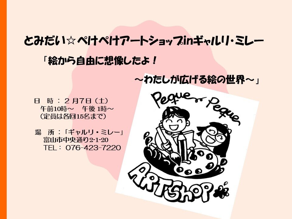 ギャルリ・ミレーでは、2月7日(土)に富山大学と共同で年中児から小学生を対象としたワークショップを開催します。